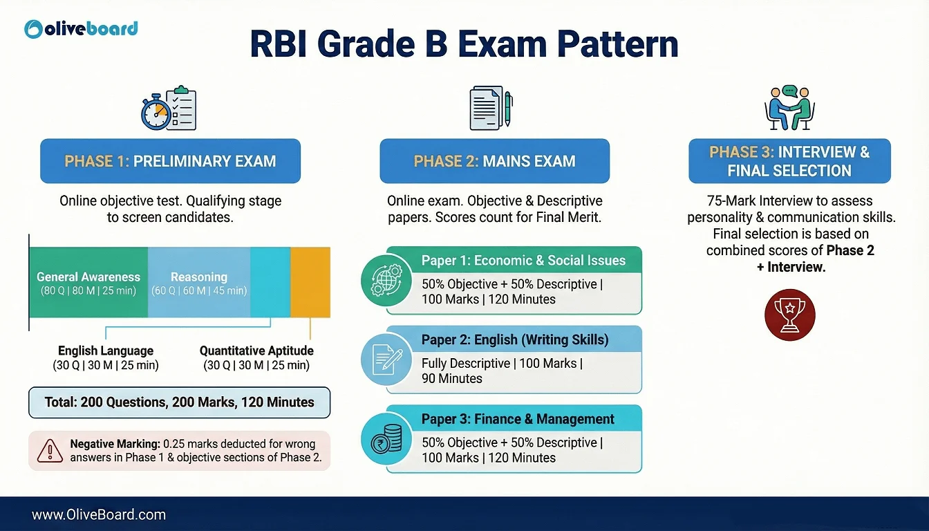 The RBI Grade B selection process consists of three stages Phase 1, Phase 2, and the Interview each carrying different marks and importance. Phase 1 is a qualifying exam with 200 marks and includes a negative marking of 0.25 for each wrong answer. Phase 2 carries 300 marks, and negative marking applies only to objective questions. Marks from Phase 2 are counted toward the final merit. The final stage is the Interview, which carries 75 marks and is also included in the final selection. Together, Phase 2 and the Interview determine the final result.